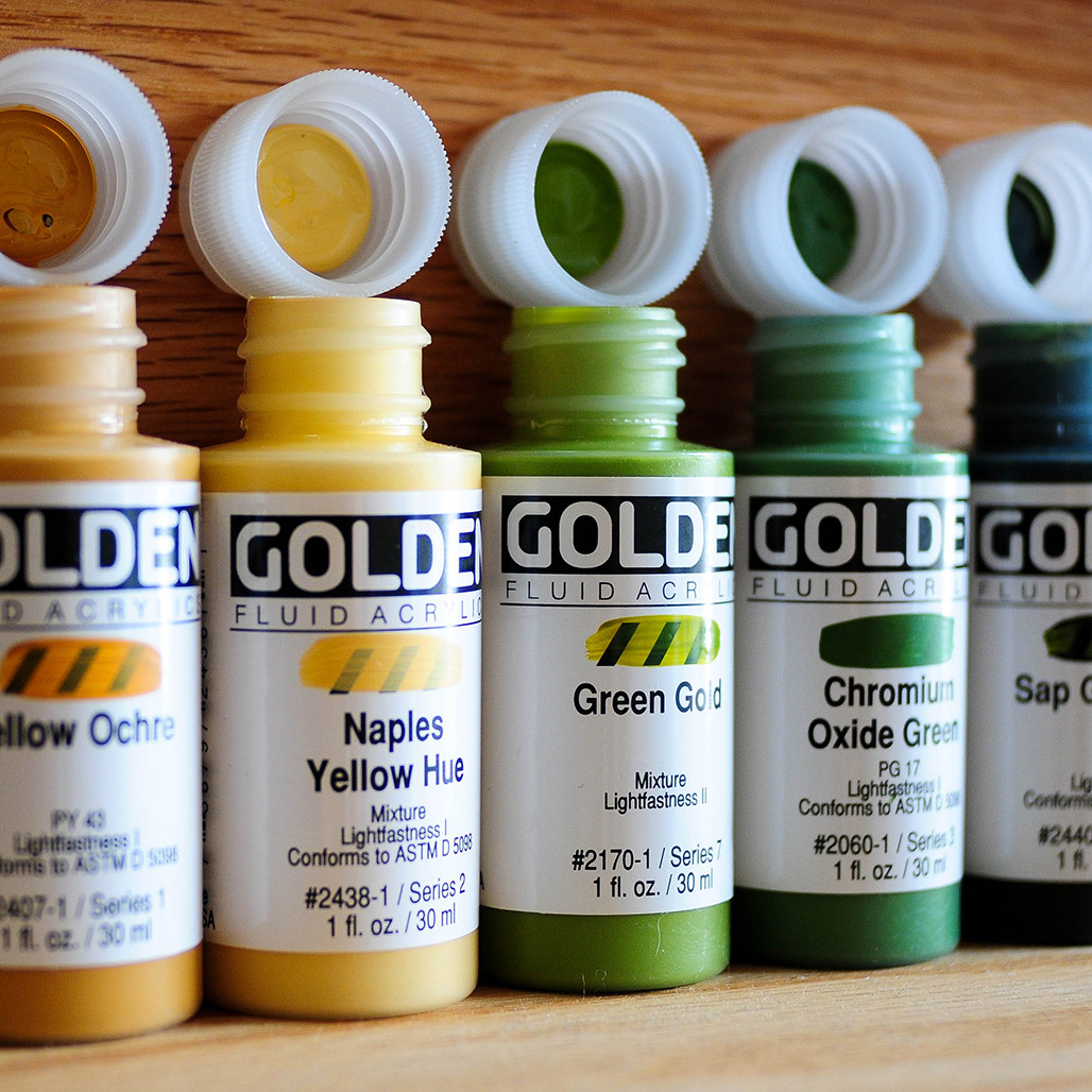 Golden Fluid Acrylics have a viscosity similar to acrylic inks. They have the same pigment load as Golden Heavy Body Acrylics, but in a fluid form, straight from the bottle!