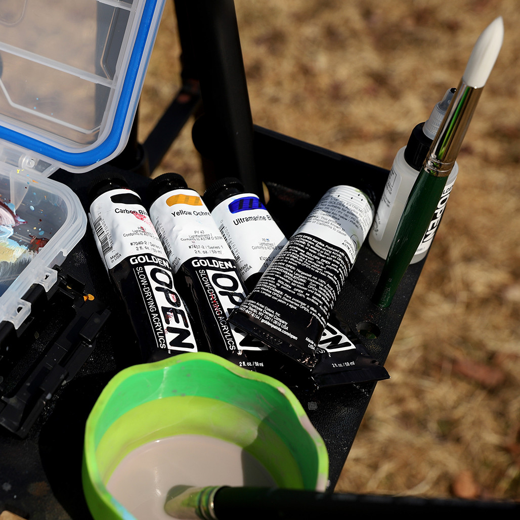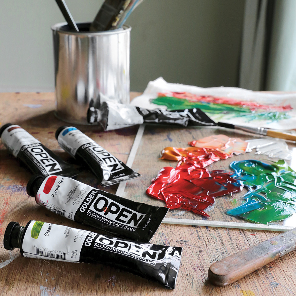 Golden OPEN is a slow-drying acrylic paint with a slightly softer consistency than Golden Heavy Body Acrylics. The increased working time of these colors expands their range to include more traditional techniques once only possible with oil paints. Their versatility allows professional artists to explore acrylic portraiture and landscape painting that rely on softening, shading, glazing, and creating fine detail. The slow-drying capability of OPEN Acrylics also makes them suitable for some printmaking techniques.
