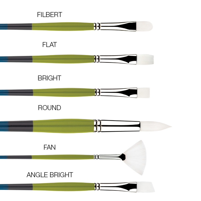 These colorful Snap! brushes feature stiffer, white taklon secured to a three-tone, long, wooden handle with a nickel ferrule.