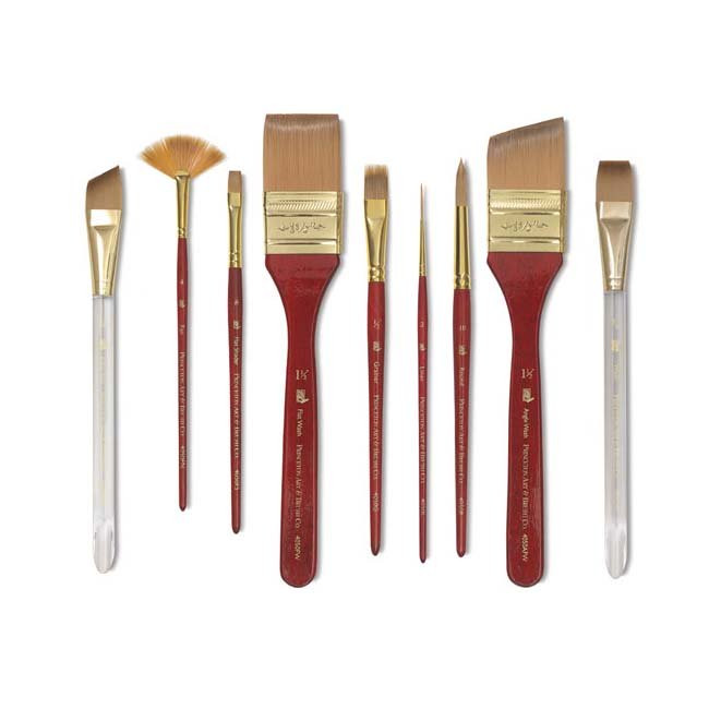 Distinctive acrylic and watercolor brushes with a synthetic sable blend for excellent brushability and color handling capacity. Featuring richly distinctive gold ferrules and marbleized red hardwood handles, except the wash brushes, which have clear acrylic handles with spatula ends. Brushes are short handled.