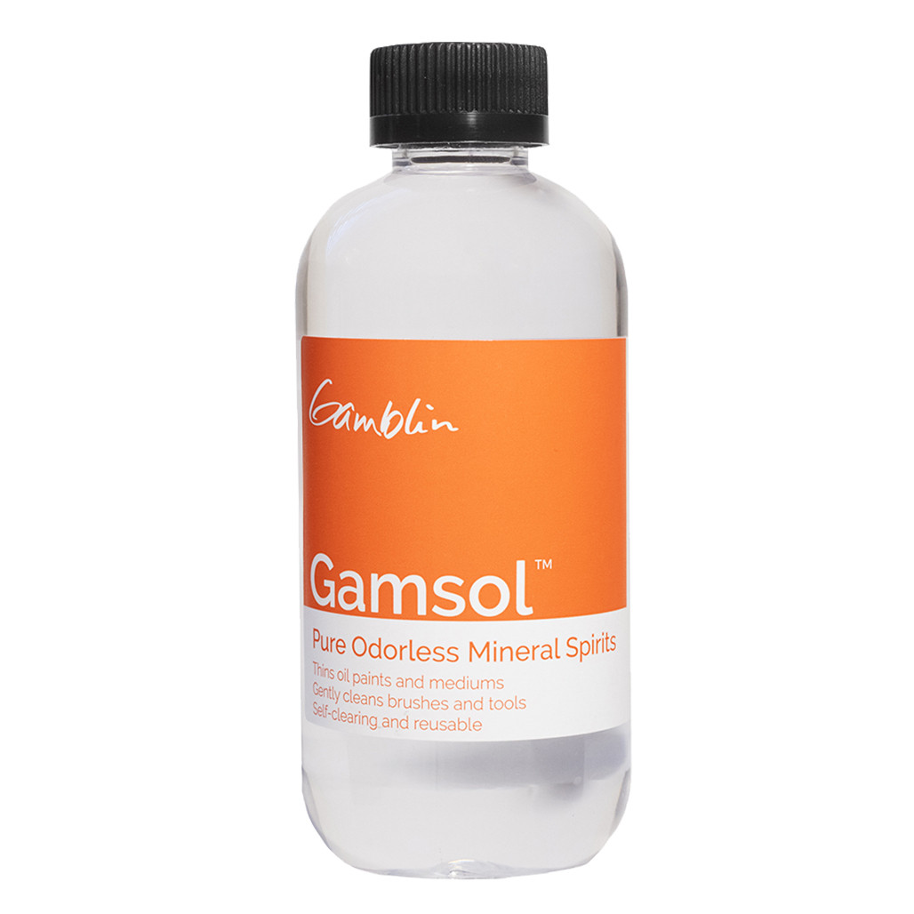 Gamsol is the safest, cleanest, and 100% pure odorless mineral spirit. Gamsol is strong enough to thin oil colors and Gamblin alkyd resin mediums and can be reused until the solvent will no longer clear. Gamsol cannot dissolve damar or other natural resins and will cloud damar varnish if used as an extender.