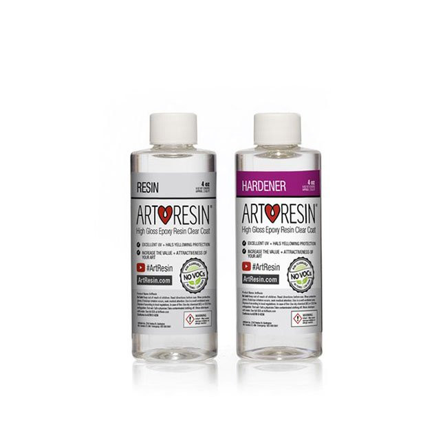 Want to add a little love to your painting, drawing, puzzle, or project? ArtResin is a high-gloss epoxy resin clear coat that makes your work pop while also protecting it. Resin contains no VOC or fumes and boasts unparalleled non-yellowing protection. The process is easy! Mix equal parts from each bottle, stir for 3 minutes, pour onto your project, and spread. Leave your piece to dry for 24 hours and then love it forever. This ArtResin Mini Kit covers approximately 2 square feet. For the ArtResin Starter Kit, please click here.