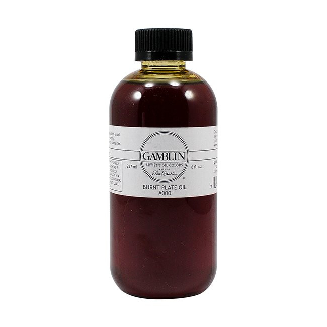 Burnt Plate oil can be added in a small quantity to a printing ink to lower its viscosity (add too much and you will lose detail in the print). Burnt plate oil #000 has a low tack and is best compatibile with relief inks. 8oz