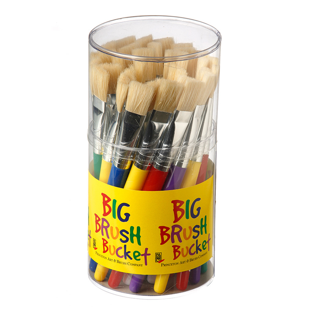 Princeton Big Brush Buckets contain 30 inexpensive, natural bristle brushes with a large handle that makes it easy for children to hold. Great for use with acrylic, oil, and tempera paint in classrooms and daycares. These brushes feature firm bristles and are not suitable for watercolors.