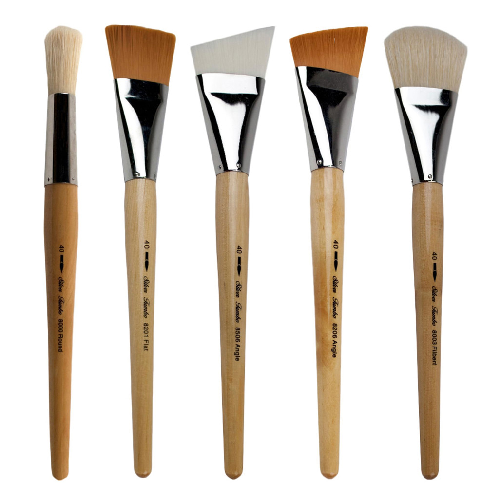 Silver Brush Silver Jumbo Brushes are the perfect brush for large-sized painting such as murals, easel painters, and furniture. Their perfectly balanced, matte handles rest comfortably in your hand and a fine nickel-plated brass ferrule is affixed with glue and nails for added durability.